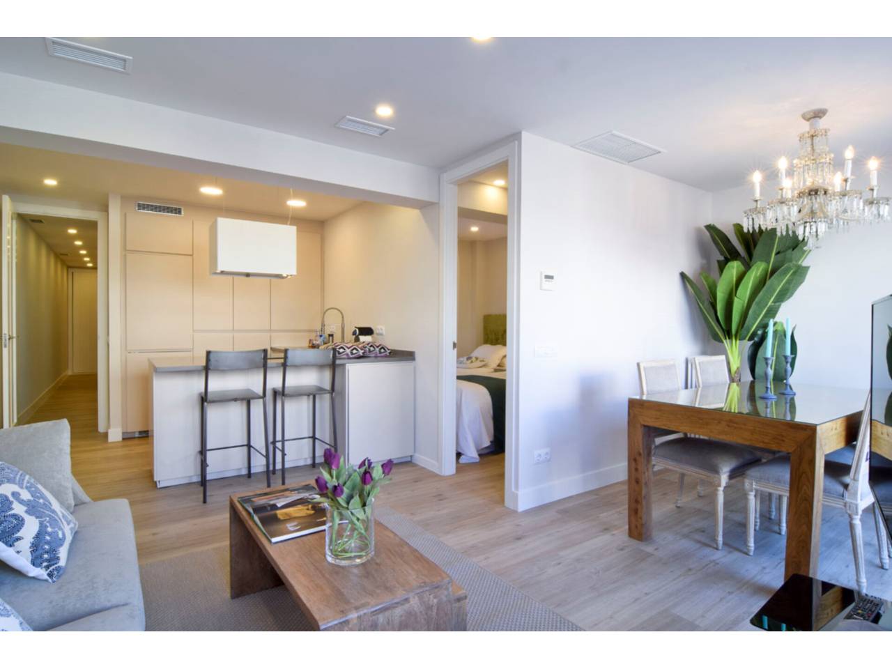Todo unido tenemos el hall de entrada, salón, comedor y cocina integrada equipada y amueblada.