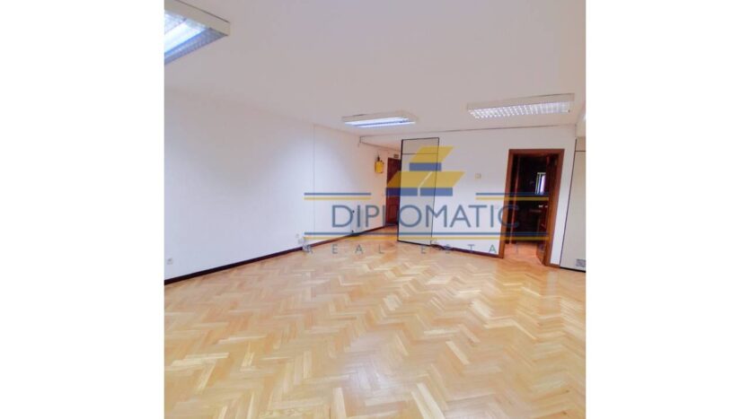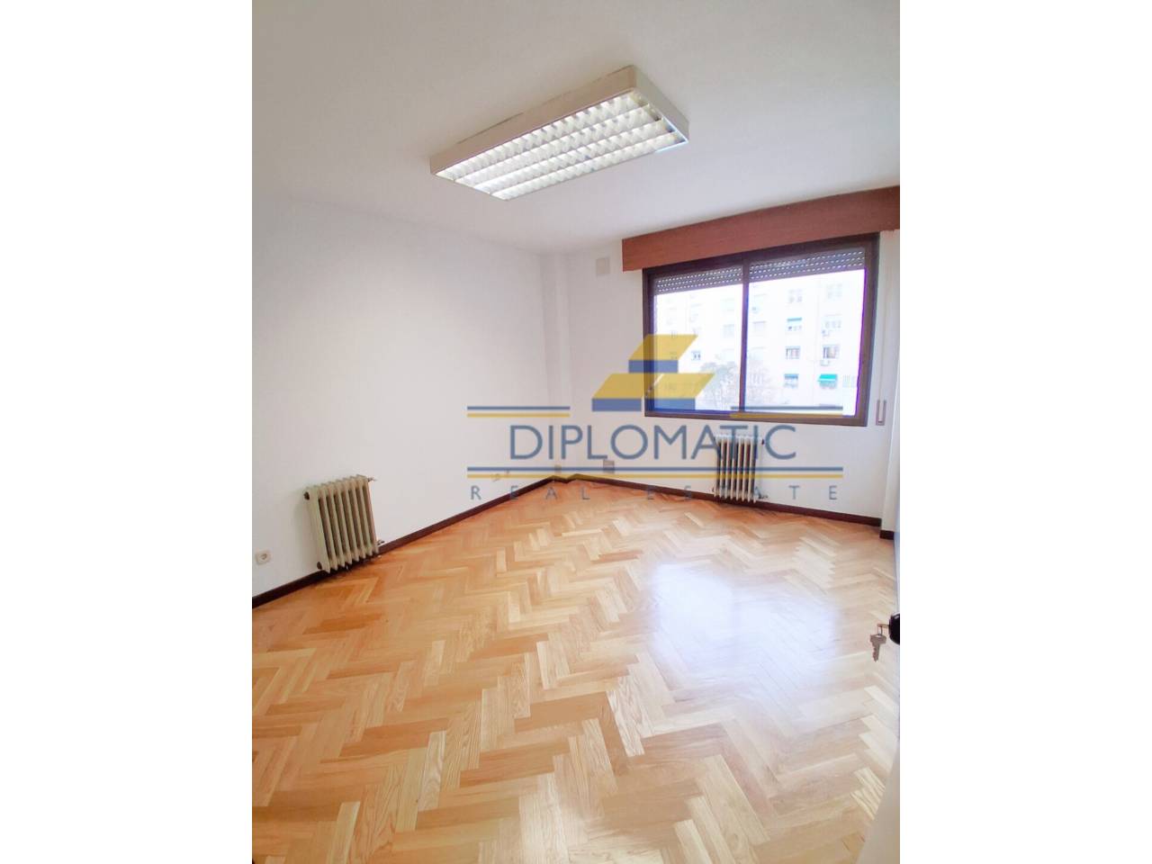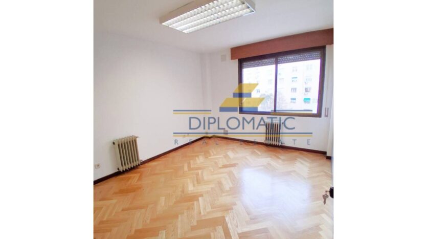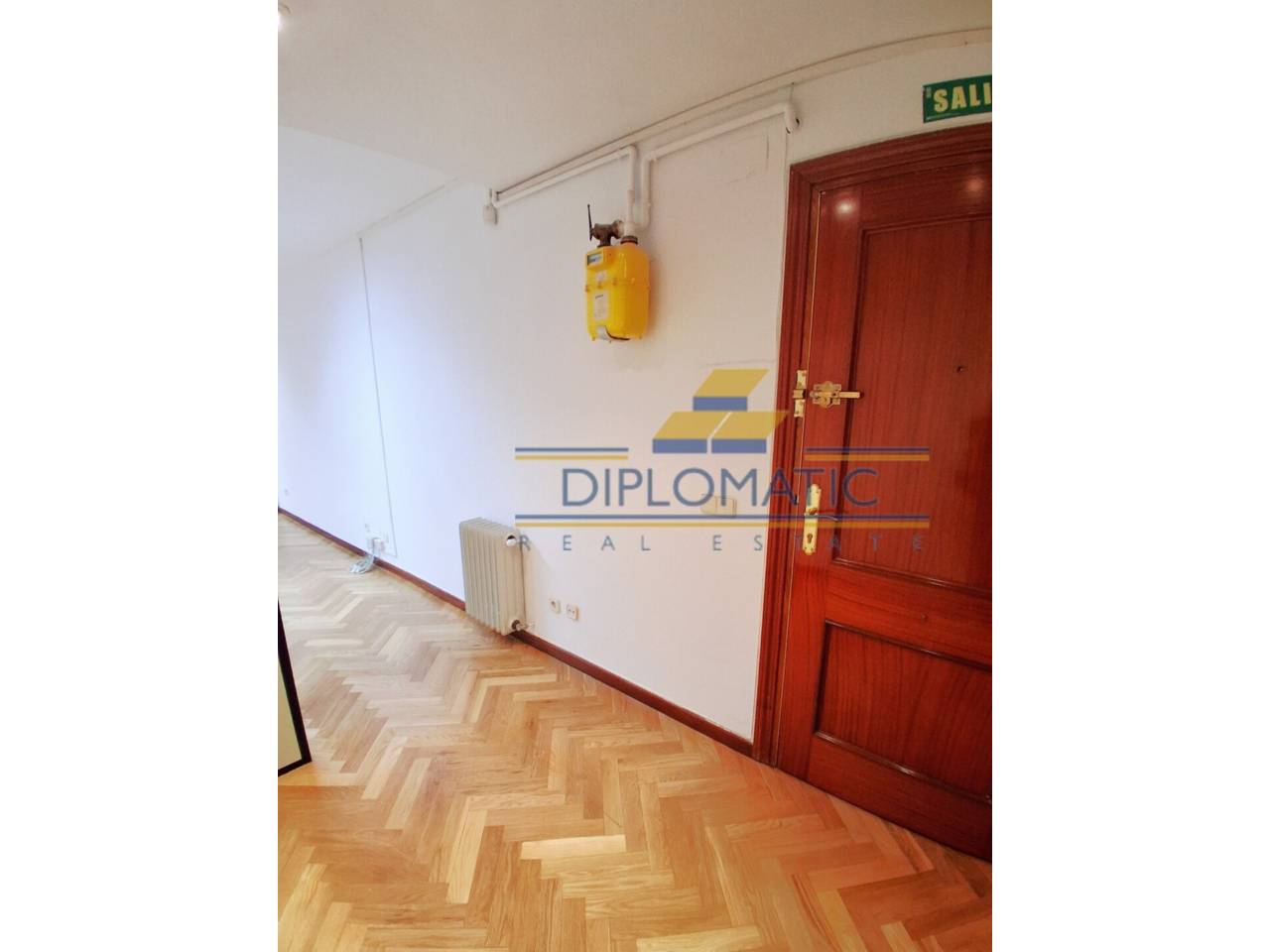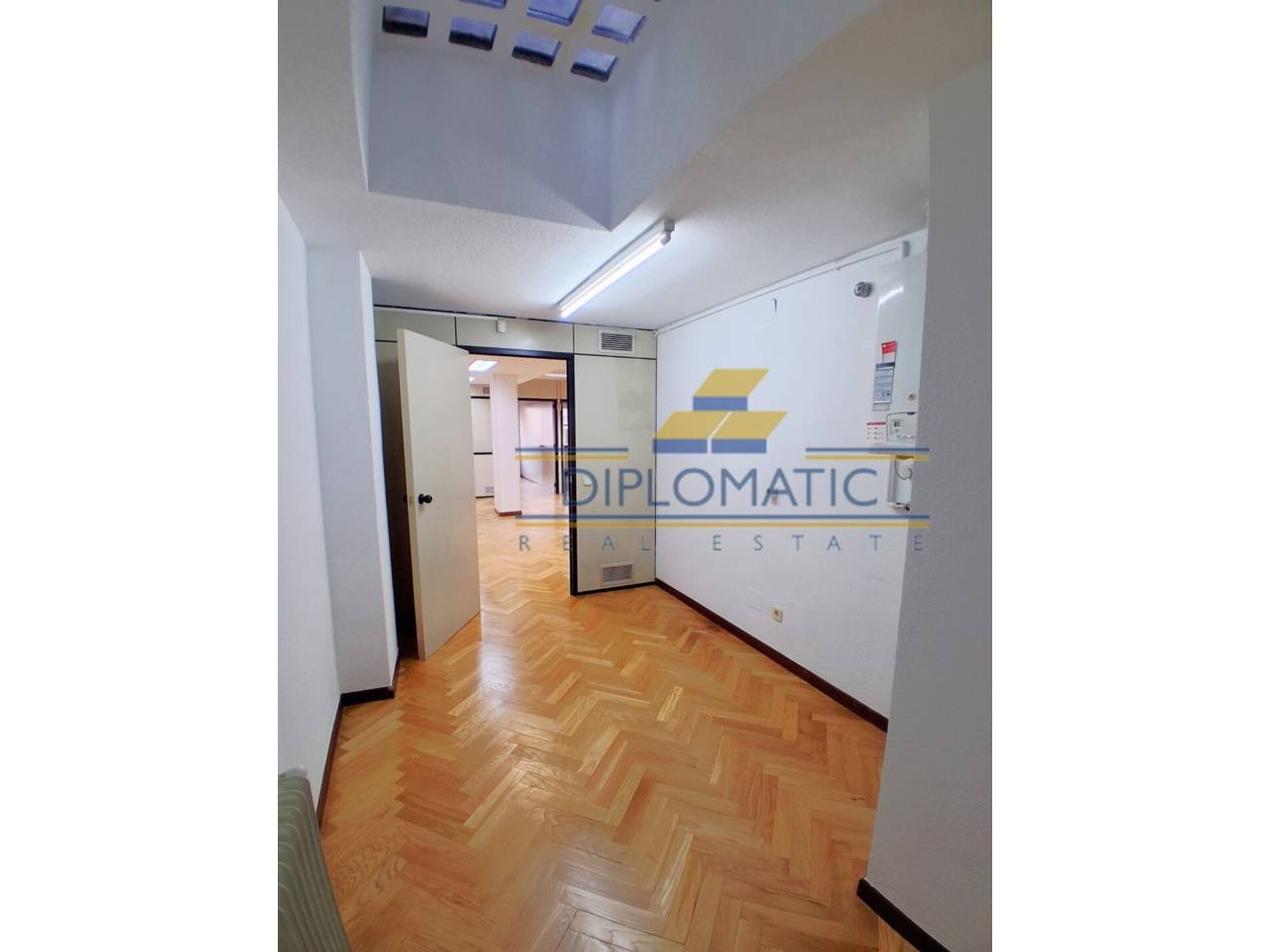 Esta señorial oficina con suelos de parquet esta distribuida en un vestíbulo (recepción) con armario empotrado de cortesía, una amplia sala general, 2 despachos divididos con mamparas con vistas despejadas a amplio patio de manzana, 1 almacén/despacho dividido también con mamparas y área de 2 aseos dentro de las oficinas.