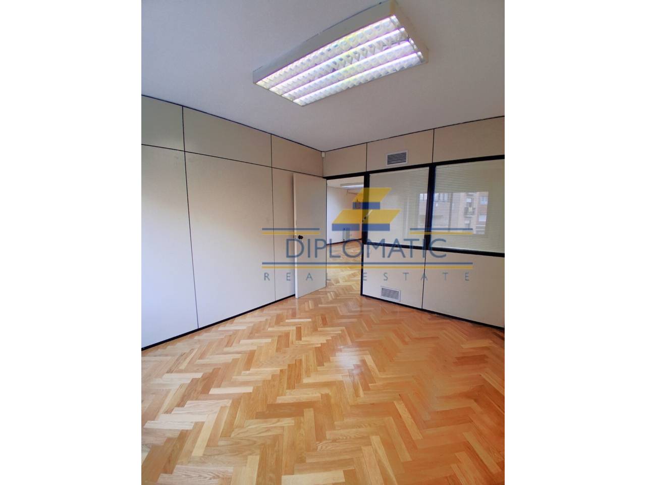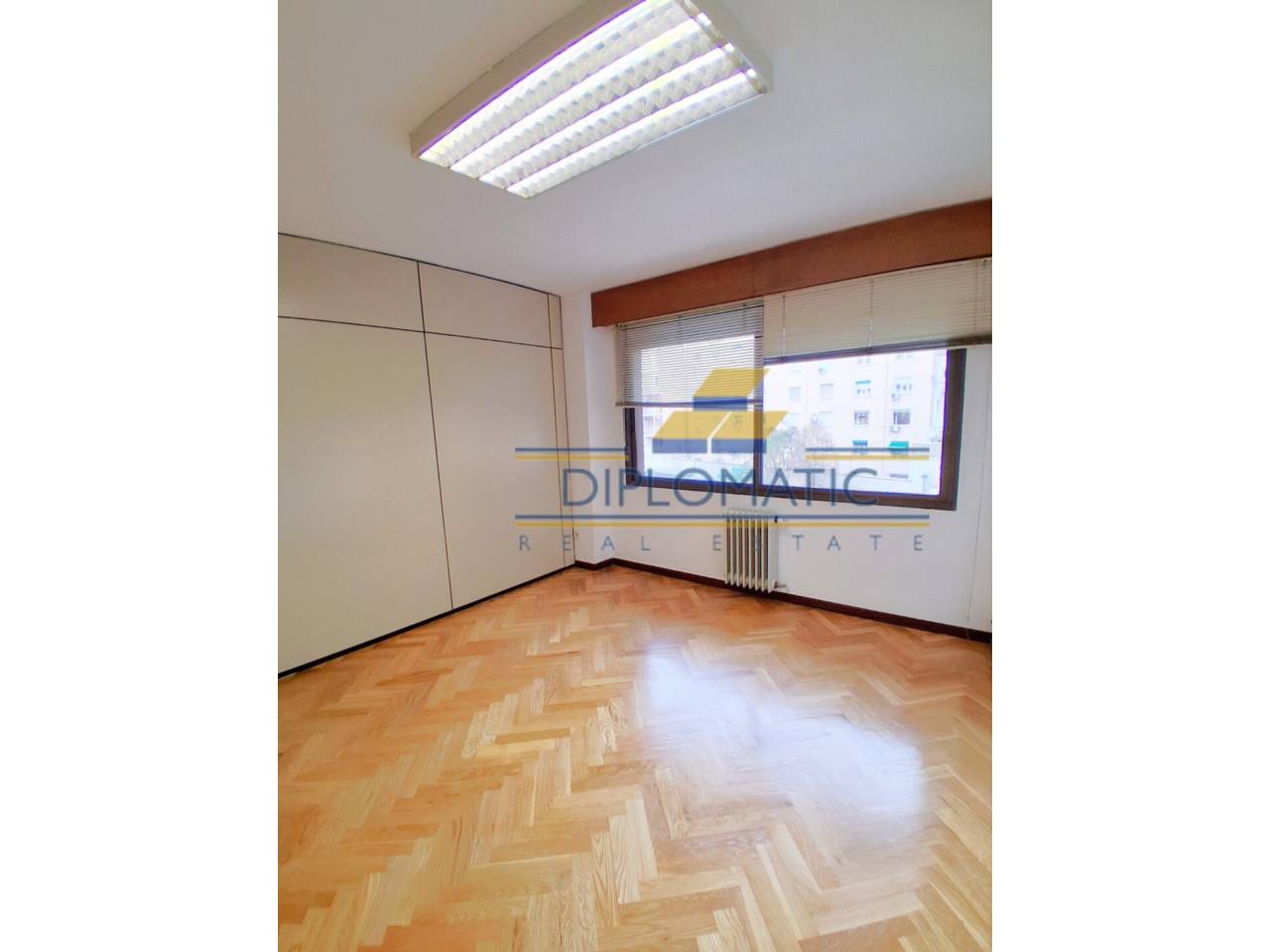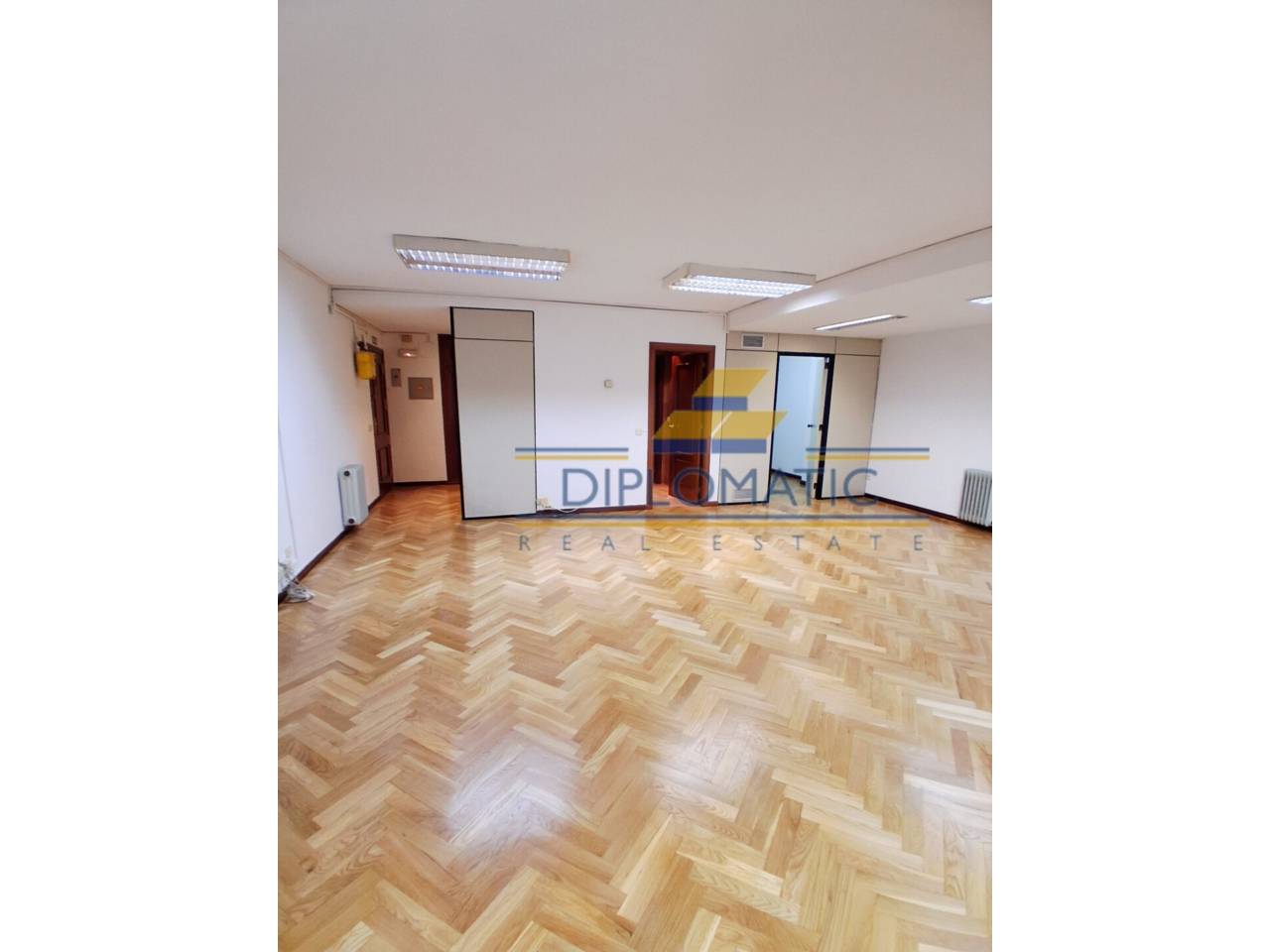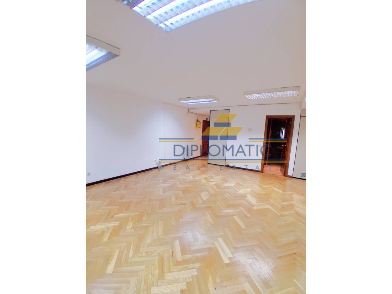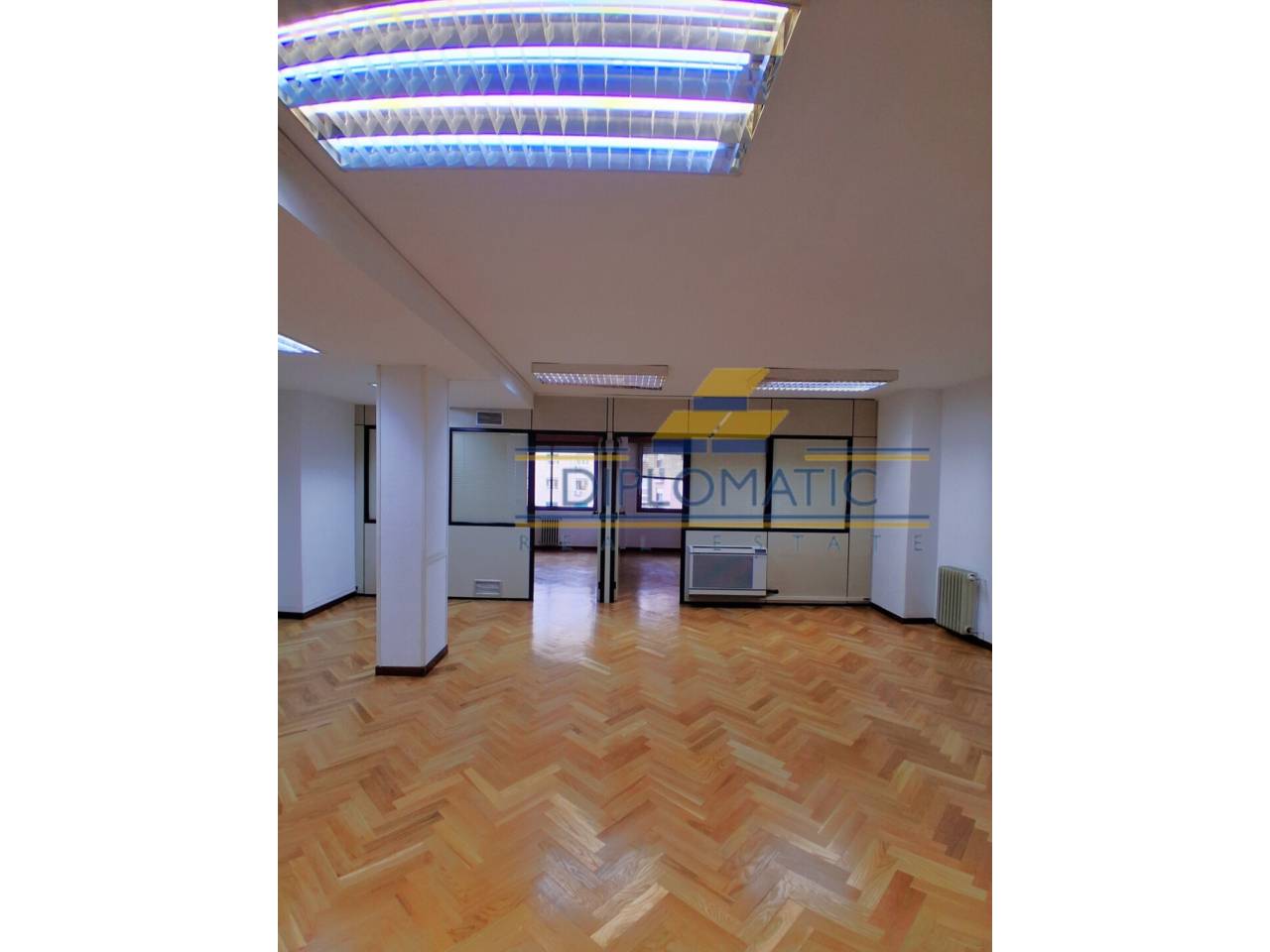 Esta señorial oficina con suelos de parquet esta distribuida en un vestíbulo (recepción) con armario empotrado de cortesía, una amplia sala general, 2 despachos divididos con mamparas con vistas despejadas a amplio patio de manzana, 1 almacén/despacho dividido también con mamparas y área de 2 aseos dentro de las oficinas.