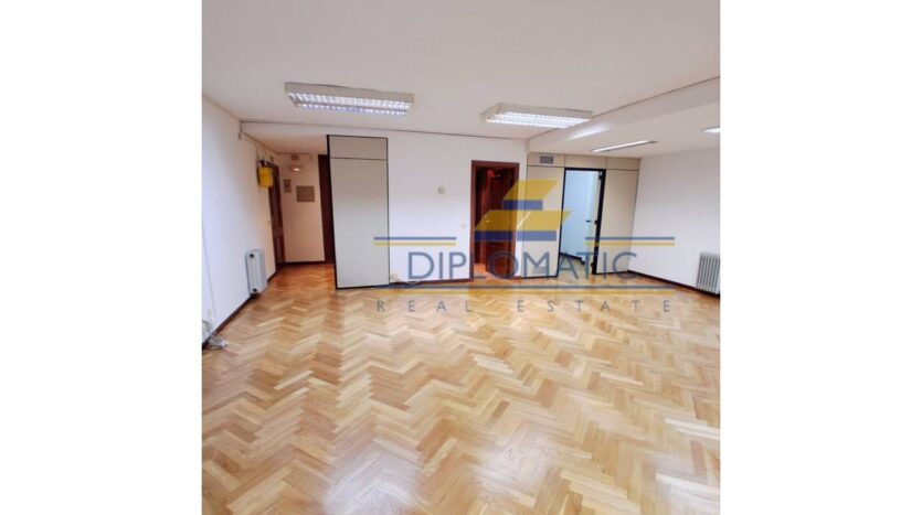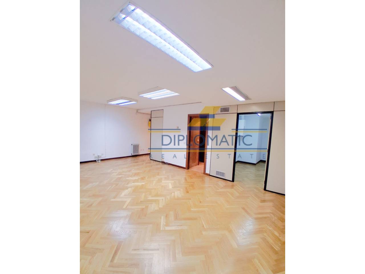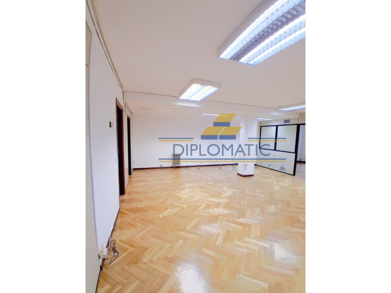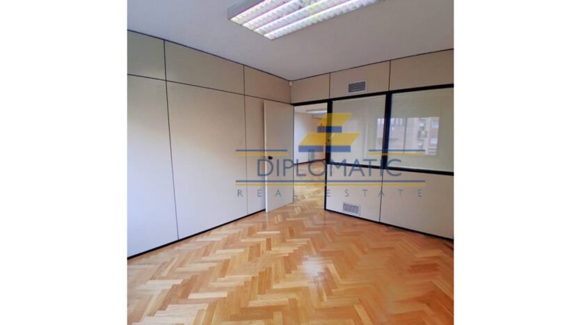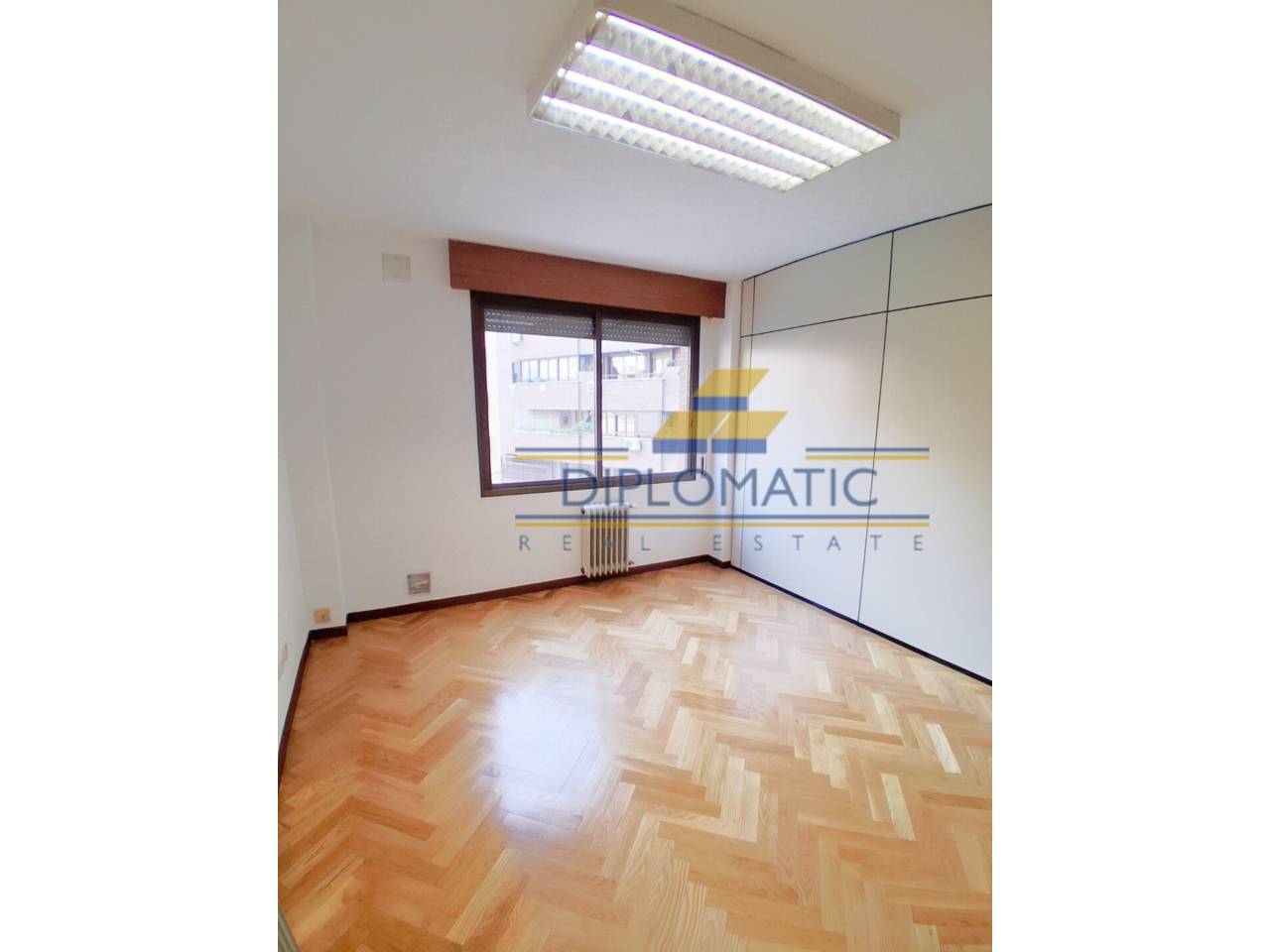 Esta señorial oficina con suelos de parquet esta distribuida en un vestíbulo (recepción) con armario empotrado de cortesía, una amplia sala general, 2 despachos divididos con mamparas con vistas despejadas a amplio patio de manzana, 1 almacén/despacho dividido también con mamparas y área de 2 aseos dentro de las oficinas.